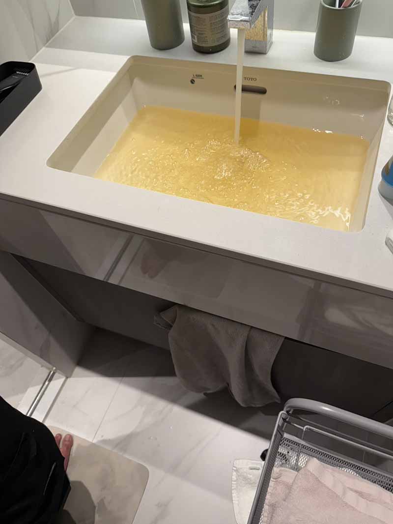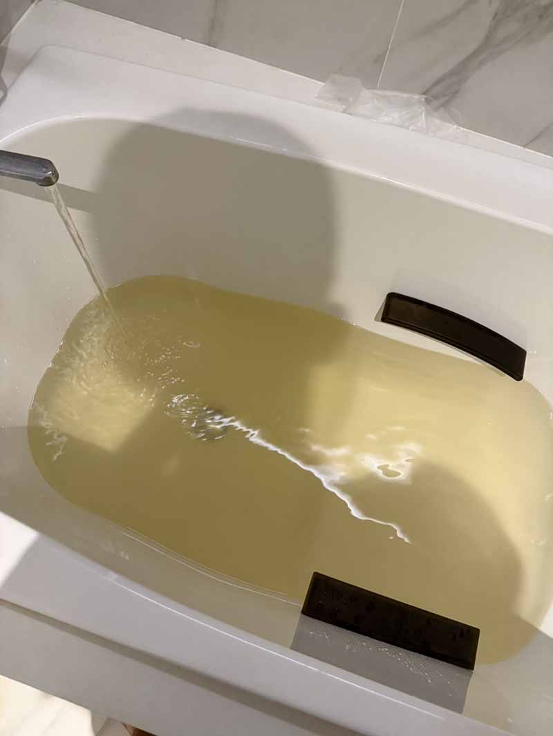 洗面器と浴槽にたまる茶色の水