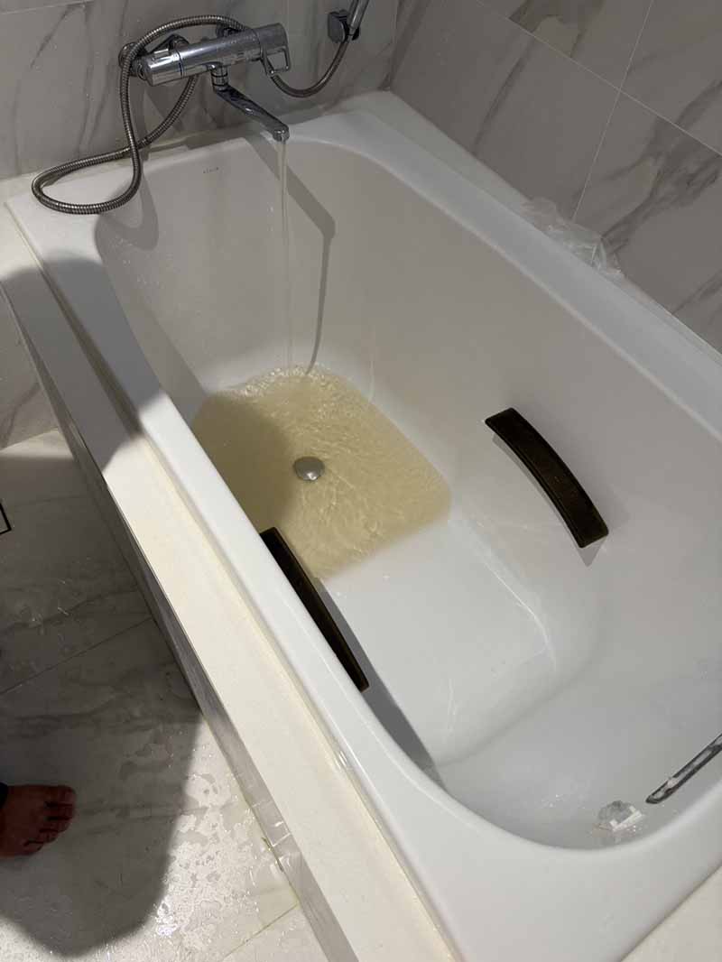 本物件では貯水槽の清掃が行われた後、室内の蛇口から出る水が黄色から茶色に濁る状態となりました。実際に浴槽へ水を溜めると明らかに変色しており、生活用水として使用することに不安を感じた入居者は、部屋での生活は難しいと判断してホテルに滞在することになりました。
